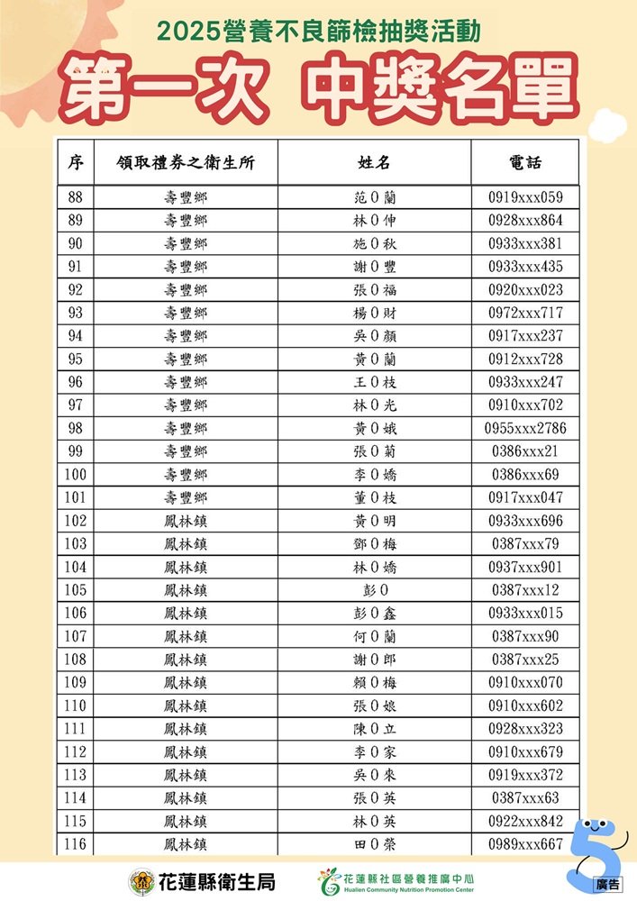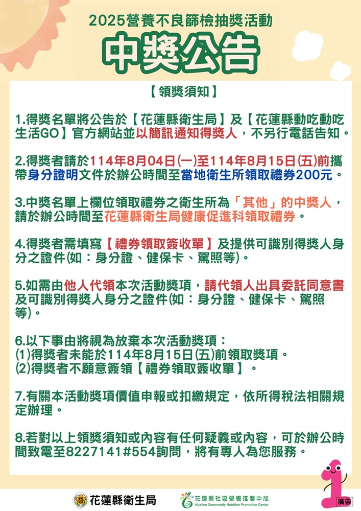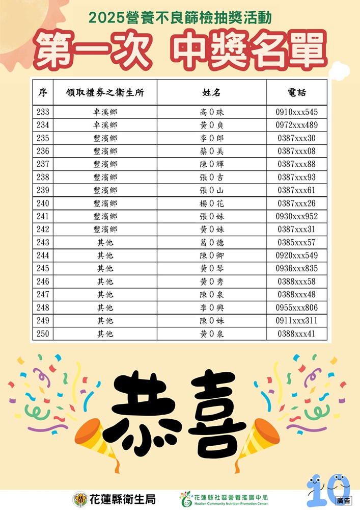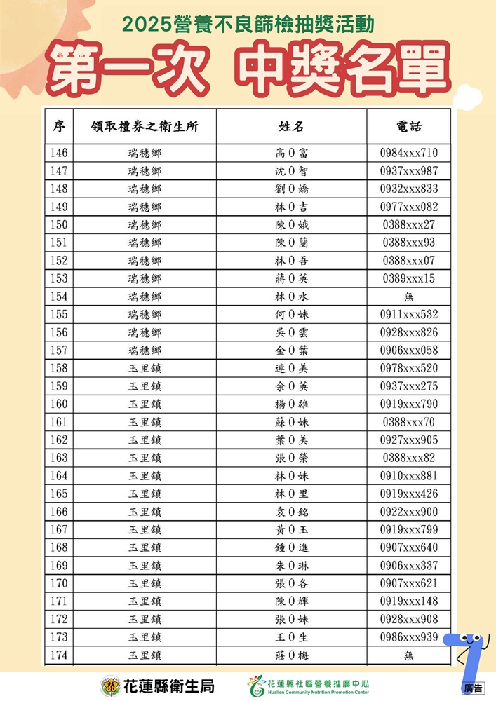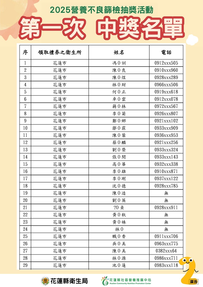 114年花蓮縣營養不良篩檢 第一次抽獎活動【中獎名單及須知】