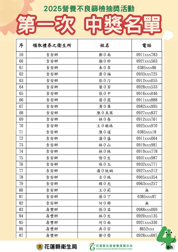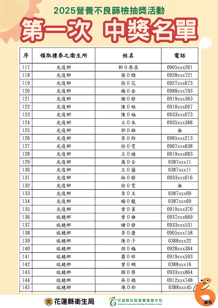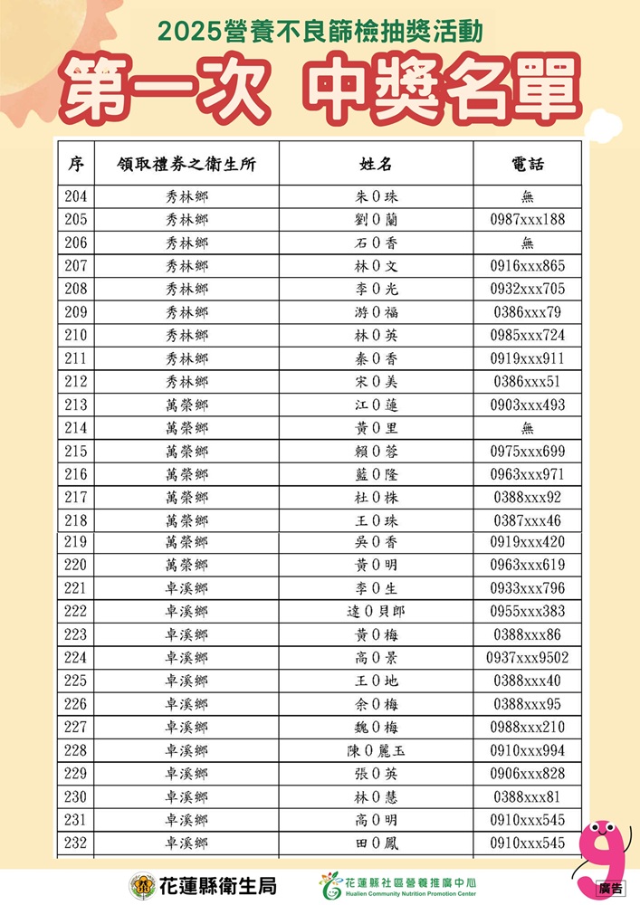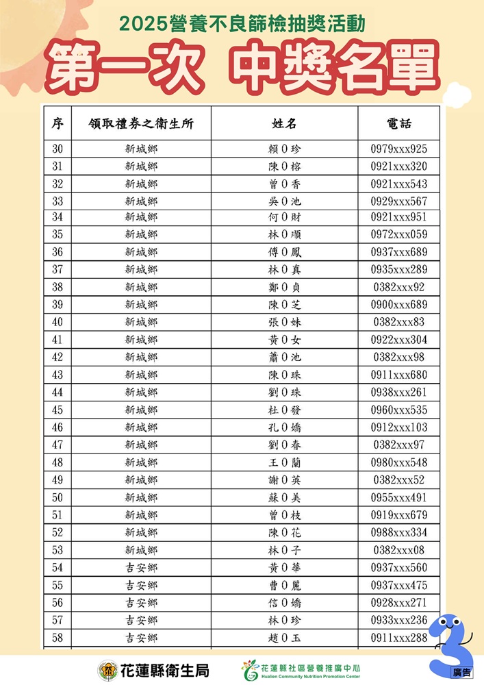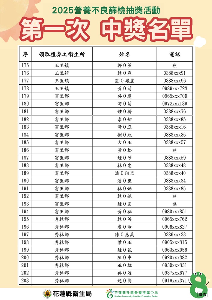 114年花蓮縣營養不良篩檢 第一次抽獎活動【中獎名單及須知】