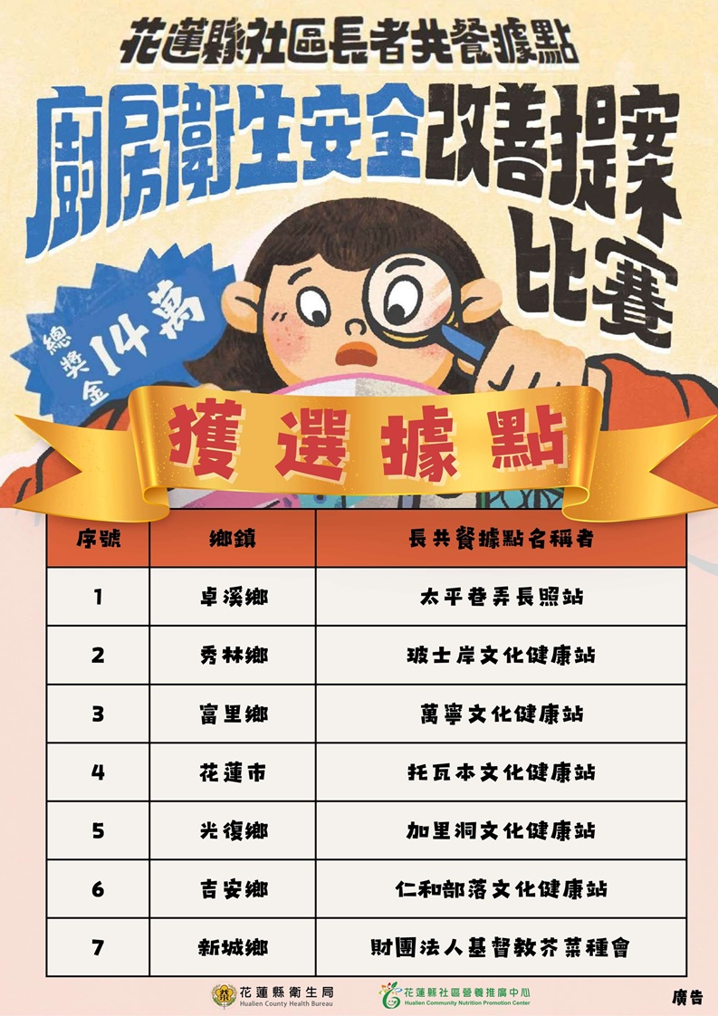 動吃快訊 news 114年第三屆【廚房衛生安全改善提案比賽】獲選據點 花蓮縣社區長者共餐據點 【第三屆廚房衛生安全改善提案比賽】結果出爐!!! 恭喜以下 7家據點獲選提案比賽 近期將與獲選之據點聯繫後續獎品領取或寄送相關事宜 如有任何疑問請來電 03-8227141分機258 黃營養師 返回列表