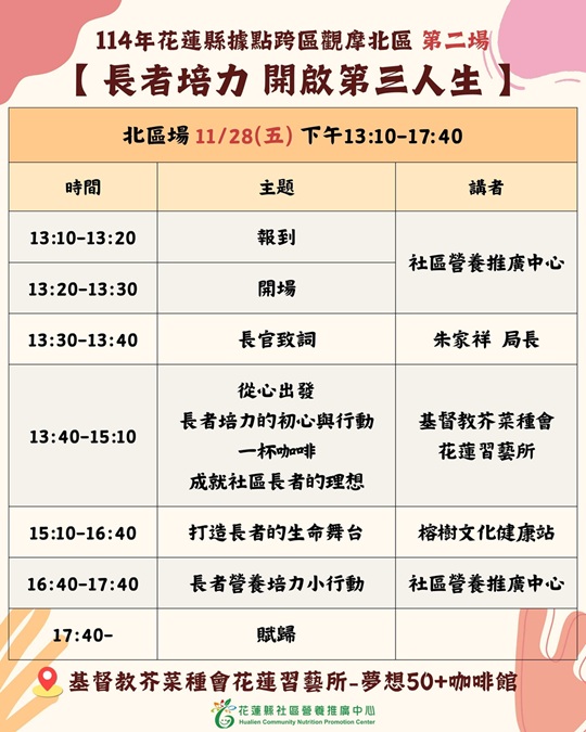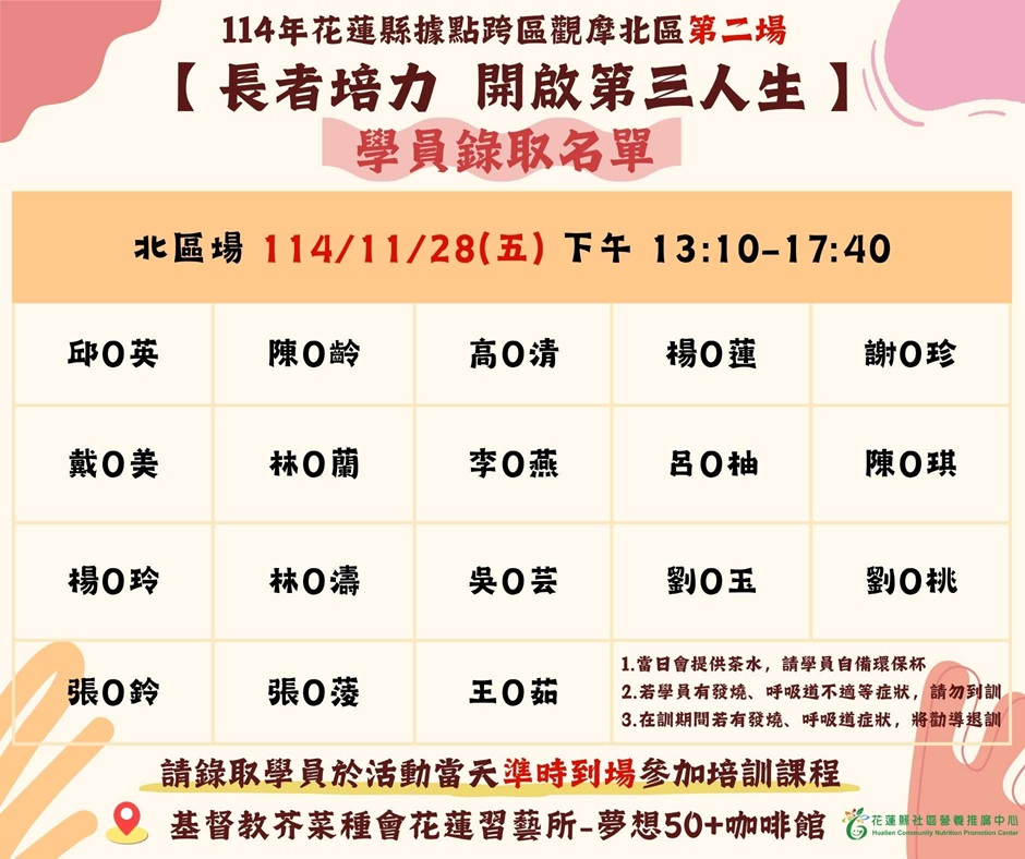 動吃快訊 news 114年花蓮縣據點跨區觀摩北區【第二場】錄取名單 【長者培力,開啟第三人生】學員錄取名單 「第二場」跨區觀摩原定11/11(二)因颱風假延至11/28(五) 地點:基督教芥菜種會花蓮習藝所-夢想50+咖啡館 地址:花蓮縣新城鄉北埔路13號 返回列表
