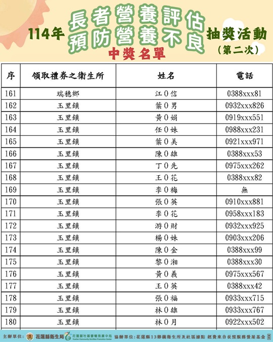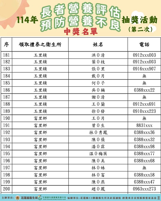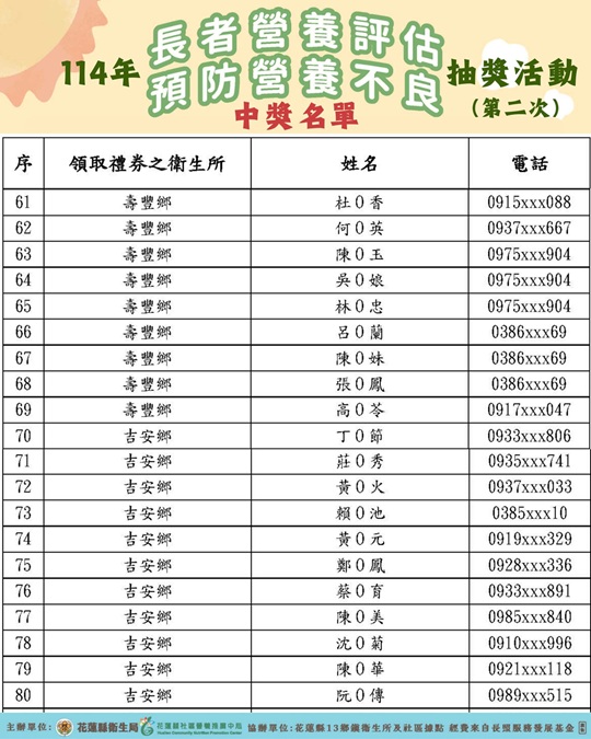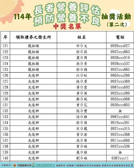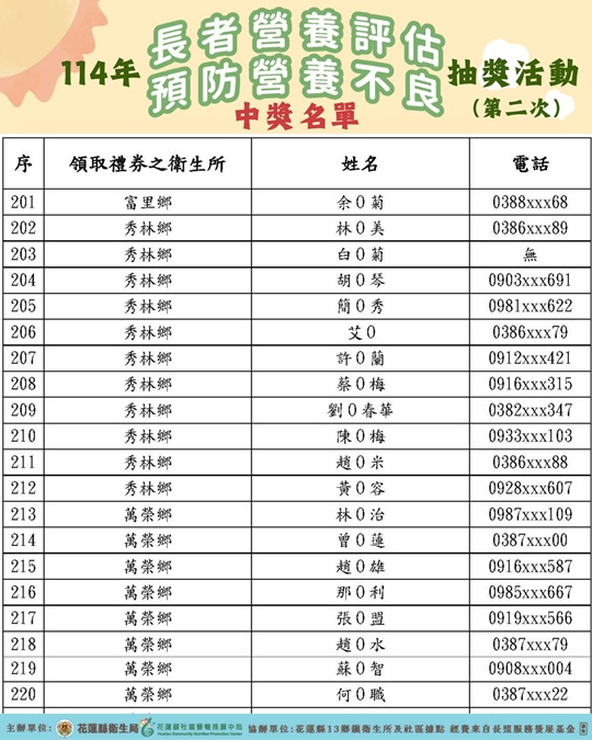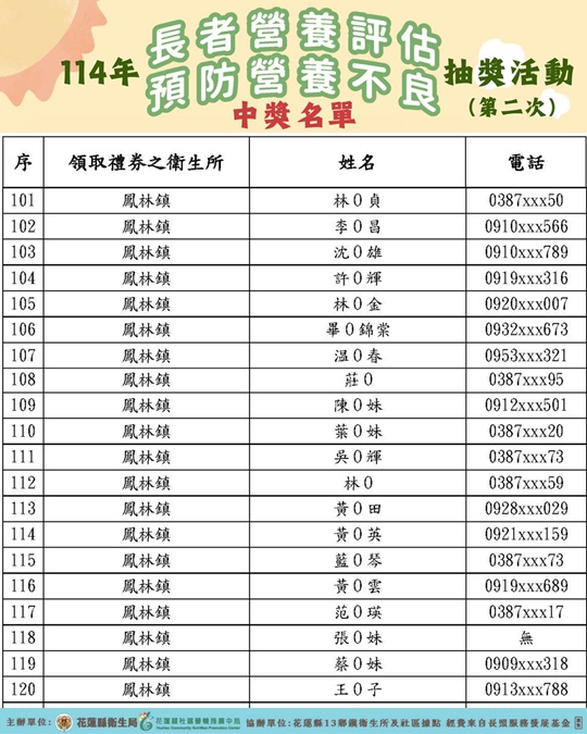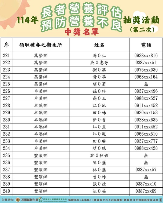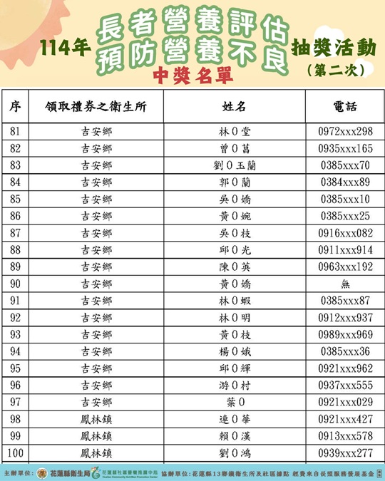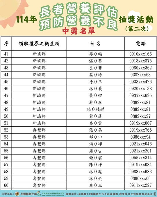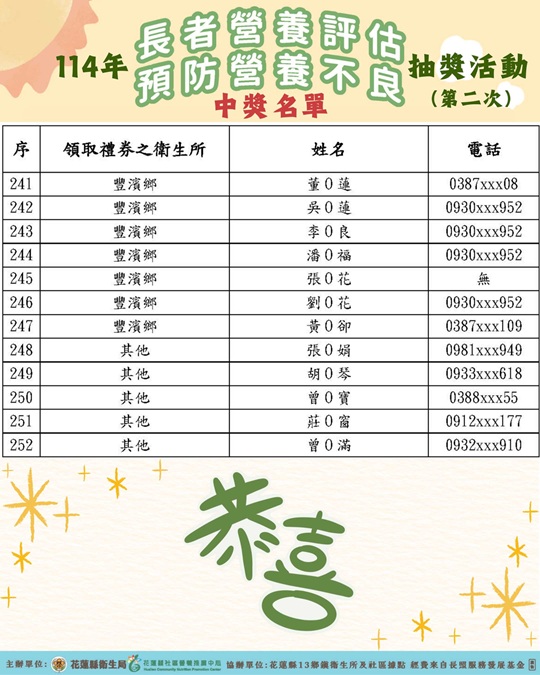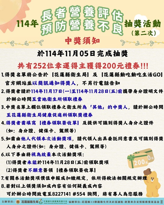 動吃快訊 news 114年花蓮縣營養不良篩檢 第二次抽獎活動【中獎名單及須知】 營養不良篩檢【中獎名單及須知】 如需由他人代領本次活動禮券 請代理人出具委託同意書及可識別得獎人身分證之證件 (如: 身分證、健保卡、駕照等) 歡迎下載附件檔案: 114年營養不良篩檢第二次中獎【委託代領同意書】 114年營養篩檢第2次中獎【委託代領同意書】 返回列表
